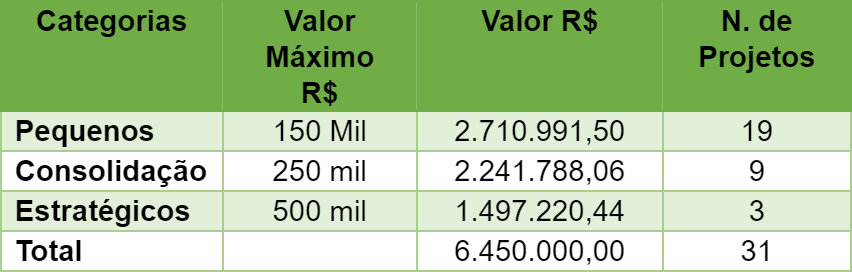 Os 31 projetos selecionados neste edital são divididos em três categorias, cada uma com uma valor máximo para as propostas, que nem sempre solicitam esse teto. Abaixo o número de projetos por categoria: