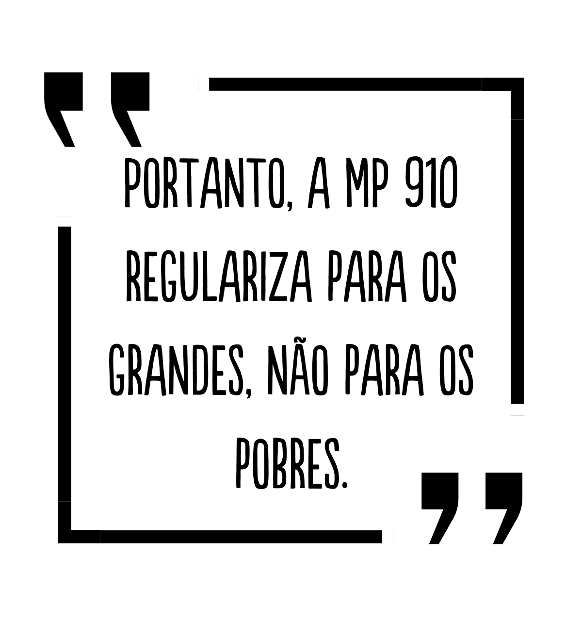 Acontece que a MP 910 é muito mais cruel, ela traz um processo que redimensiona os prazos e amplia os limites de terras a serem regularizados. De fato, é uma MP que regulariza a grilagem no Brasil. Em um de seus artigos ela diz que o apossamento dessa terra tem que ser de forma mansa, não violenta, tranquila, ou seja, tem que ter uma certa concessão pra entrar na terra. Quem entrou nessa terra de forma mansa foram as empresas e os grandes, todos os pequenos produtores estão sempre sob pressão: há pressão contra quilombolas, indígenas e pequenos agricultores. Isso só prova que a MP desconhece nossa realidade. Desde a chegada dos portugueses, foi sempre impedido que os pobres, negros e índios desse país tivessem acesso à terra e a MP reafirma isso. Portanto, é uma lei que só vai legitimar o processo da apropriação irregular. A constituição federal garante que as terras da União se transformem em políticas que atendam as milhares de famílias que hoje querem terra, e não é essa MP que irá fazer isso.