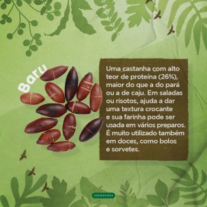 - O baru possui cerca de 26% de teor de proteínas, mais do que o coco-da-bahia, a castanha do pará ou a de caju. Essa amêndoa pode ser saboreada por si só ou misturada a saladas e risotos para dar um crocante a mais. Processada, ela gera uma farinha que pode ser aproveitada na confeitaria, como em tortas, bolos e cookies. O baru é facilmente encontrado em grandes redes de supermercados.