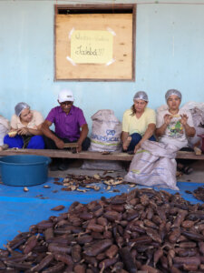 - Quebra do fruto: estágio inicial consiste em romper a casca dura do jatobá, geralmente com o auxílio de um instrumento, para liberar a polpa interna. Também é uma fase de seleção dos frutos de boa qualidade, descartando os deteriorados.
