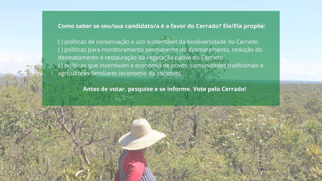 “É preciso pesquisar as propostas e a trajetória de candidatos que receberão nossos votos neste ano, para verificar se eles se comprometem com o uso sustentável da biodiversidade, com a redução do desmatamento no Cerrado, e com a economia de povos, comunidades tradicionais e agricultores familiares, que chamamos de ‘economia da sociobio’. Essa atitude salva o Cerrado”, completa.