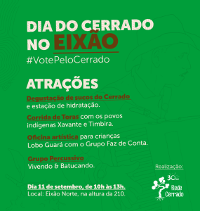 A Corrida fará a abertura do evento com a concentração marcada para às 9h, no Eixão Norte, na altura da 207, e a saída às 10h seguindo até a 210, onde estarão a degustação de sucos do Cerrado, atividades para a criançada, grupo de percussão e falas potentes em defesa da savana brasileira. Confira o card da divulgação: