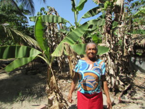 A aposentada Maria de Nazaré Teixeira dos Santos foi uma das beneficiárias que recebeu a visita técnica da equipe do ISPN no Quilombo Cariongo. Ela desenvolve várias atividades em seu quintal, mas a principal delas é a criação de galinhas, onde conta com a ajuda dos filhos e netos que vivem na comunidade. “A criação de galinha é a atividade que mais gosto de fazer aqui no meu terreiro, pois a gente consegue comer e também vender. As galinhas dão bom retorno [financeiro]. Conversando aqui, tenho a pretensão de expandir minha criação e receber as direções técnicas certas para melhorar o que tenho”, explica.