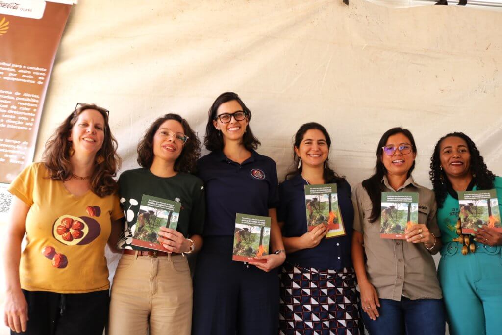 Isabel Schmidt, Águeda Lourenço, Mariana Senra. Lívia Moura, Elisa Sette e Laudeci Monteiro: o Guia Prático de PMIF foi distribuído durante o X Encontro dos Povos do Cerrado. (Foto: Méle Dornelas / ISPN)