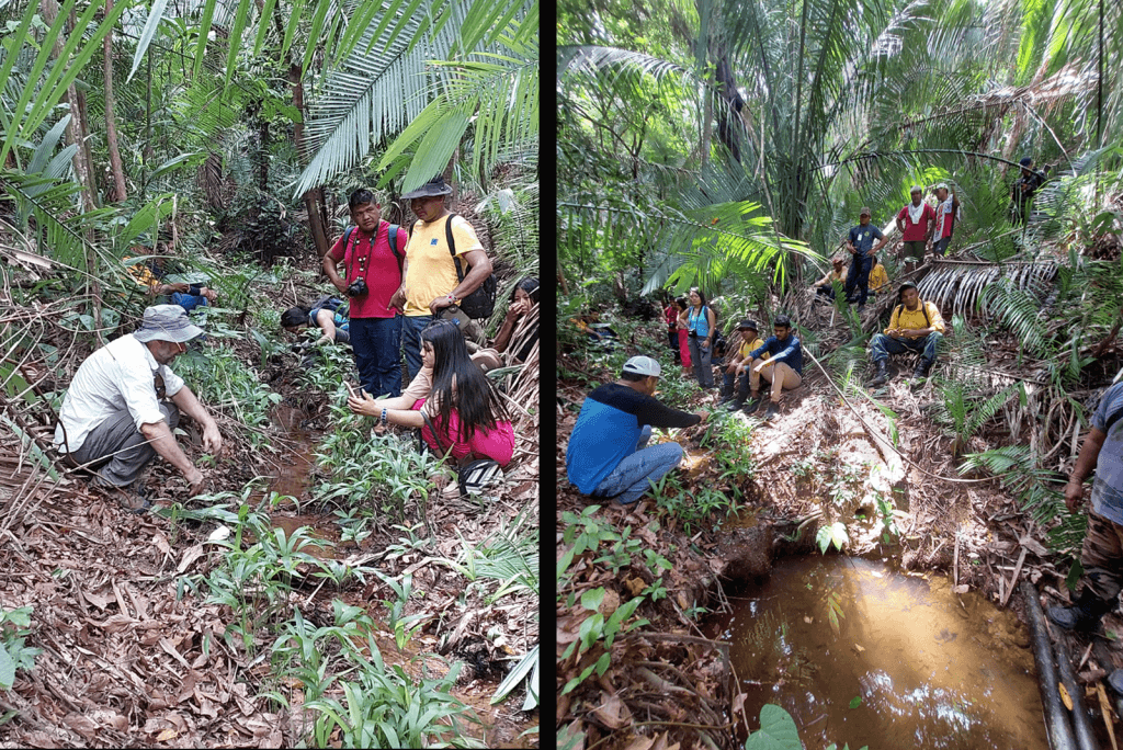 De voadeira os/as visitantes se deslocaram ao Lago da Bolívia, um patrimônio da TI, que é palco de constante tensão entre indígenas e invasores não indígenas que adentram o território para caçar e pescar ilegalmente. A partir da base de apoio dos Guardiões, caminharam pela mata para conhecer uma das nascentes que está sendo reflorestada pelos indígenas e que há mais de cinco anos voltou a ser uma fonte perene. O local é considerado um exemplo de resiliência e de retorno da biodiversidade para o território. “Essa caminhada na floresta está sendo muito emocionante para mim, pois onde me criei era assim, mas agora é tudo pastagem. Estar aqui com os parentes indígenas e conhecer esse trabalho de recuperação que eles fazem mostra a força desse povo, as nossas lutas são muito parecidas”, relatou Sr. João da Cruz, do Quilombo do Onça.
