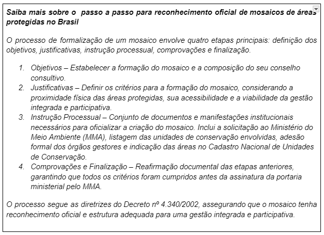 O processo envolve diversas etapas como a formulação dos objetivos e justificativas para a criação do mosaico, a composição do conselho consultivo e a instrução processual — que compreende a elaboração de documentos e a manifestação formal de adesão dos gestores das áreas protegidas envolvidas. Além disso, exige a apresentação de comprovações e culmina com a assinatura da portaria ministerial pelo Ministério do Meio Ambiente e Mudança do Clima.