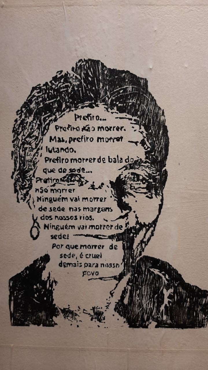 Estudante de artes visuais e neta de geraizeiros, Conchita também diz que a inserção da palavra “prefiro” aconteceu por essa ser uma expressão muito manifestada pelas personagens. “Prefiro… Prefiro não morrer, mas prefiro morrer lutando” é uma das afirmações escritas em letras manuais na xilogravura que retrata a agricultora familiar do município de Correntina, Dona Ana, uma das personagens deste trabalho.