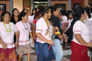 Mulheres Guajajara entoam cantos tradicionais na língua durante a 3ª Campanha de Sensibilização da Terra Indígena. Foto: Ariel Rocha/Acervo ISPN.
