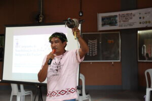 Arismar Guajajara relembra sobre como o monitoramento e a vigilância eram feitos pelos mais antigos. A liderança ressaltou como as novas tecnologias são incorporadas nas atividades de proteção territorial pelos indígenas. Foto: Ariel Rocha/Acervo ISPN