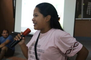 Djelma Guajajara compartilha com a comunidade suas experiências enquanto jovem liderança no território Rio Pindaré. Foto: Ariel Rocha/Acervo ISPN