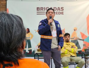 Cristiano Krahô, do povo Krahô (TO), atua numa brigada formada pelo Prevfogo, mas luta por autonomia. “Queremos uma brigada livre, que funcione o ano todo. Não é só combater, é restaurar, é cuidar. O evento foi muito importante, aprendi novas formas de agir com menos sacrifício.”