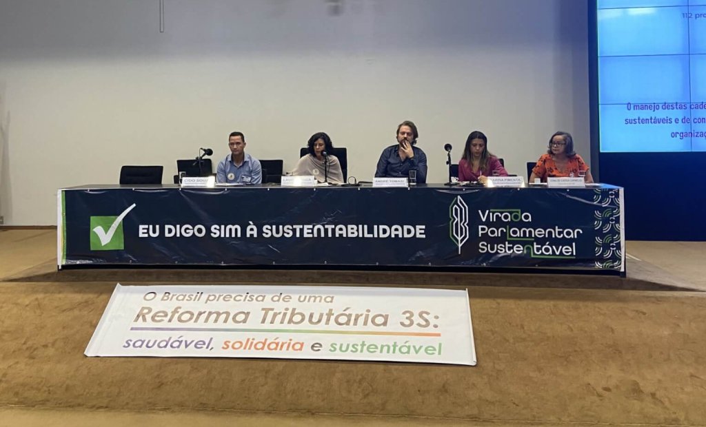Ao lado André Tomasi, integrante do Observatório da Castanha – IIEB/OCA, Carina Pimenta secretária Nacional de Bioeconomia do Ministério do Meio Ambiente), Cido Souza, da Cooperativa Grande Sertão (MG) e Presidente da União Nacional das Cooperativas de Agricultura Familiar e Economia Solidária (UNICAFES), e Edna Cássia Carmelio, consultora da GIZ, o ÓSocioBio colocou em pauta no parlamento a necessidade de políticas de tributação adequadas aos produtos das economias de povos e comunidades tradicionais, e agricultoras e agricultores familiares.