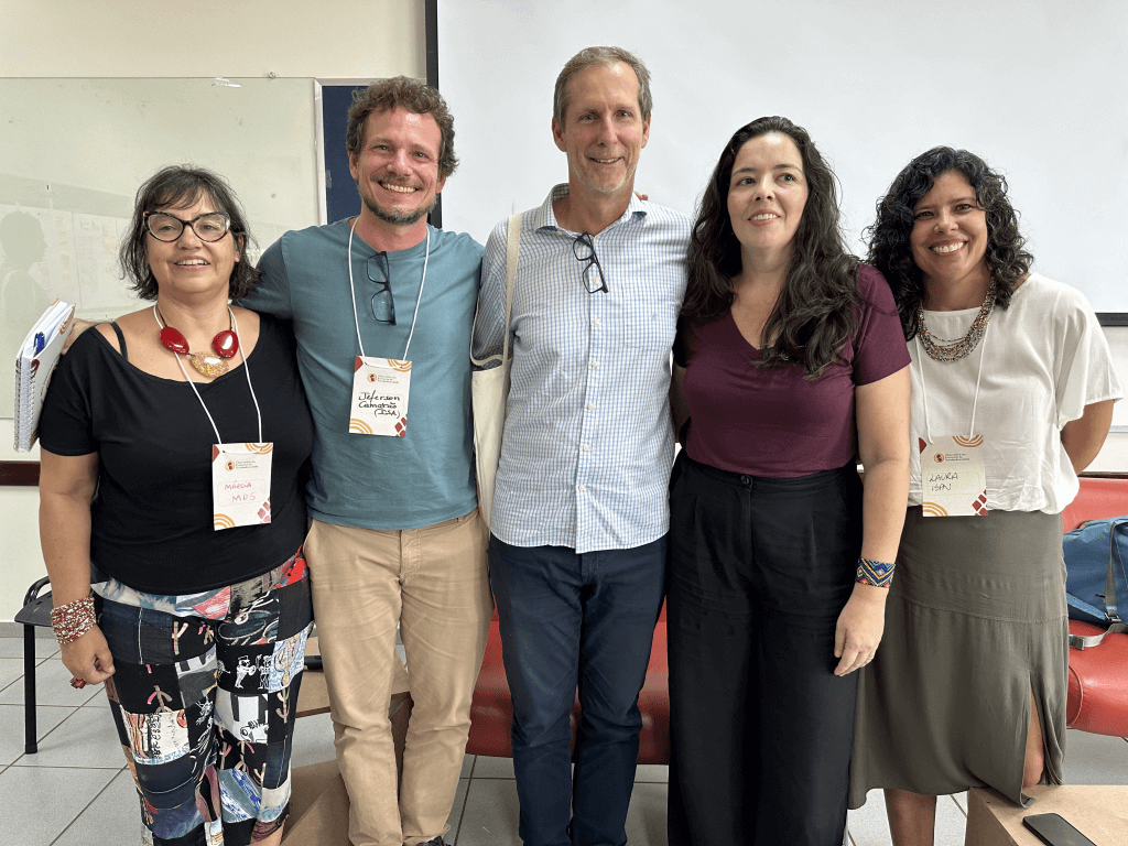 Membros do Governo Federal e do ÓSocioBio: Márcia Muchagata, do Ministério do Desenvolvimento e Assistência Social, Família e Combate à Fome; Jeferson Straatmann, do Instituto Socioambiental; Silvio Porto, da Companhia Nacional de Abastecimento (Conab)/Ministério do Desenvolvimento Agrário e Agricultura Familiar; Bruna de Vita, do Ministério do Meio Ambiente e Mudança do Clima; e Laura Souza, secretária executiva do ÓSocioBio. Foto: Camila Araujo/Acervo ISPN