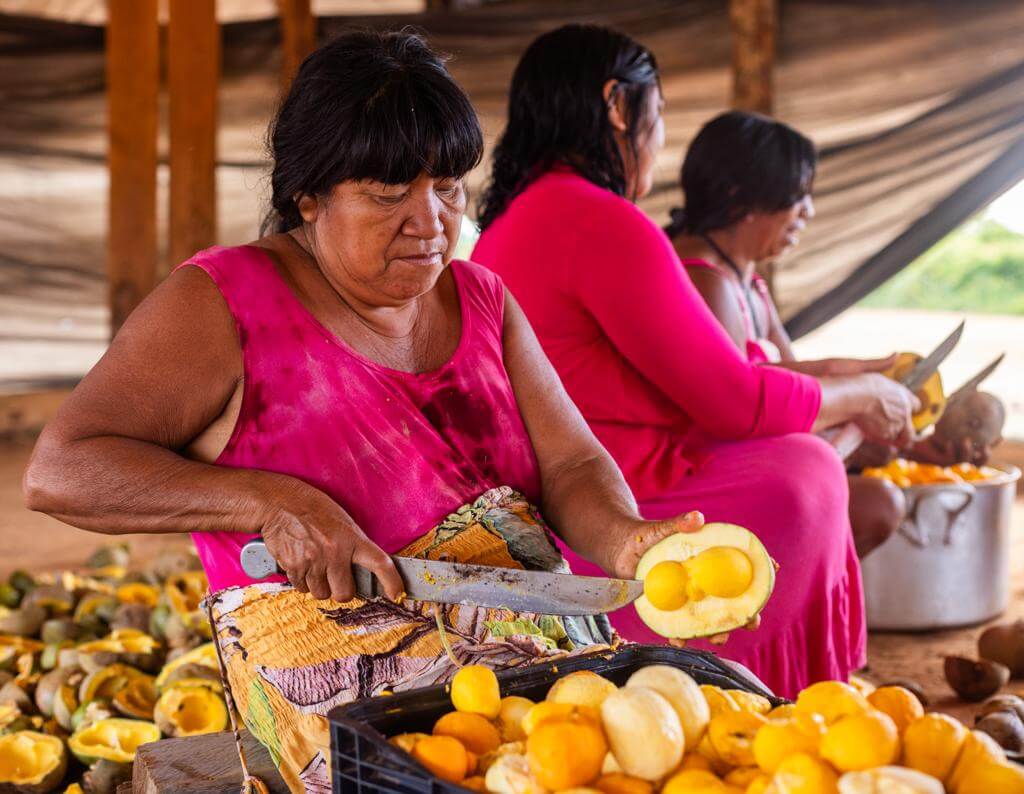 Mulheres Kisêdjê preparam o pequi para posterior processamento na miniusina (Foto: Kamikia Kisêdjê/AIK Produções)