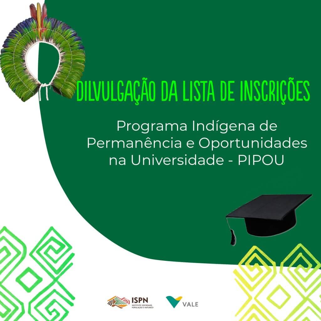 O Programa Indígena de Permanência e Oportunidades na Universidade – PIPOU, iniciativa da Vale e do ISPN, divulga a lista de estudantes inscritos (as) para concorrer às 50 bolsas de estudo a serem disponibilizadas pela iniciativa. No total foram 73 estudantes inscritos (as) pertencentes aos povos Gavião (TI Mãe Maria, no Pará); Guajajara (TIs Rio Pindaré e Caru, no Maranhão); Tupiniquim e Guarani (TIs Tupiniquim Guarani e Caieiras Velhas II, no Espírito Santo); e Krenak (TI Krenak, em Minas Gerais). Nos próximos dias o Programa fará a seleção desses inscritos, cujos critérios principais serão a análise dos projetos de intervenção comunitários e a distribuição de vagas de forma isonômica entre os povos. O resultado final será divulgado no site do ISPN no dia 11 de outubro de 2021.