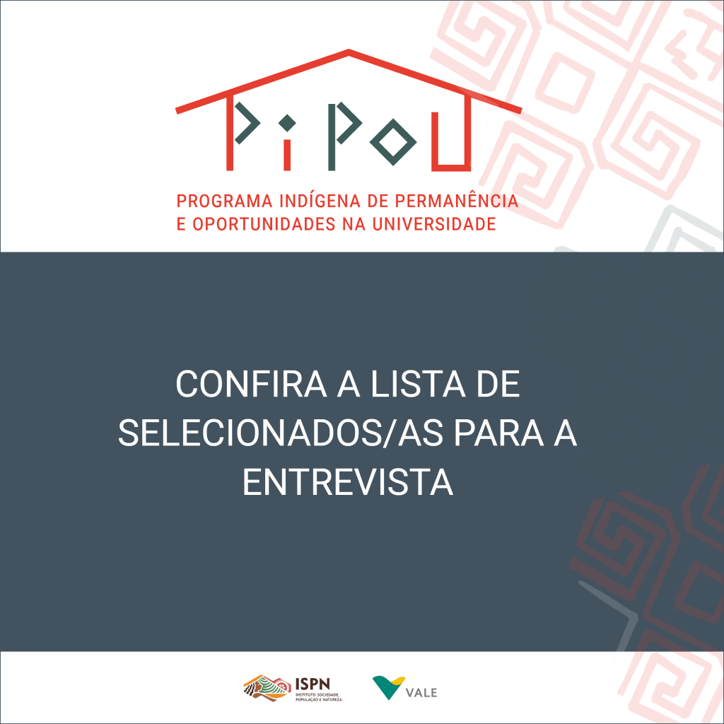 O Programa Indígena de Permanência e Oportunidades na Universidade – PIPOU, iniciativa do ISPN e da Vale, divulga a lista de candidatos/as classificados/as para realizar a entrevista, última etapa da seleção do Edital 2022-2023. Foram  110 candidatos/as selecionados/as cujas entrevistas se darão entre os dias 27/02/2023 a 17/03/2023, conforme o cronograma do edital. Os horários e as datas das entrevistas serão comunicados aos/às candidatos/as pela equipe do Programa PIPOU.