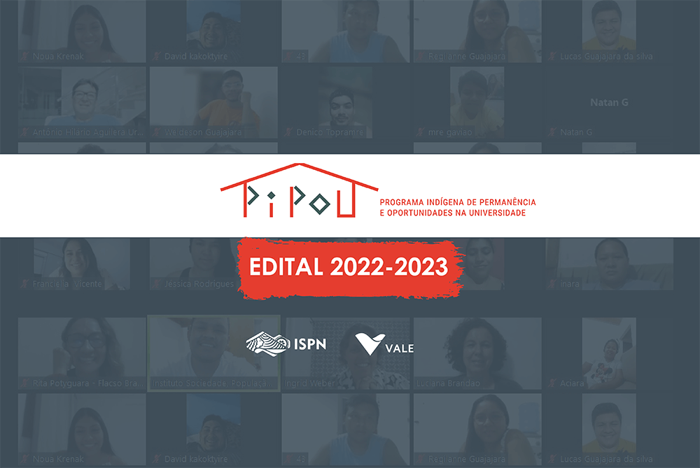 Fruto da parceria entre o ISPN e a Vale, o Programa Indígena de Permanência e Oportunidades na Universidade – PIPOU lança nesta segunda-feira, 07/11/2022, mais um edital de apoio para a permanência de indígenas no ensino superior. Serão ofertadas 55 bolsas no valor de R$ 1mil/mês, além da doação de um computador portátil. O Programa também oferece acompanhamento pedagógico e atividades extracurriculares, como a promoção de debates e reflexões que contribuam para o acesso a direitos. Após um ano de funcionamento em fase experimental, o programa se consolida como uma contribuição para o fortalecimento das iniciativas de ações afirmativas para indígenas nas Instituições de Ensino Superior (IES) do país. Neste novo edital o programa amplia o escopo do seu público-alvo para além dos povos que já mantêm relacionamento com a Vale. Veja abaixo como concorrer às vagas.
