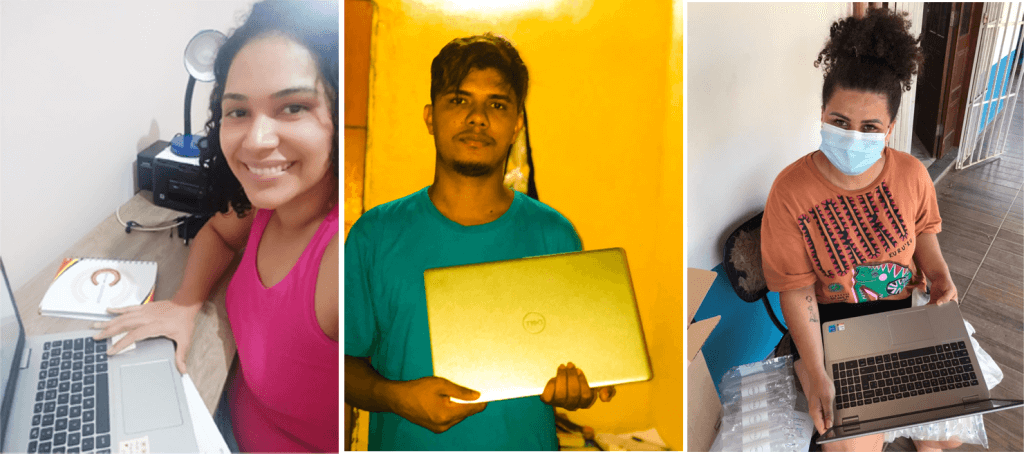 Bolsistas do Programa PIPOU receberam seus computadores como parte do pacote de benefícios ofertados pela iniciativa. Nas fotos: Taís Tupiniquim (à esquerda), Weldelson Guajajara (ao centro) e Jhenifer Tupiniquim (à direita), na ocasião da entrega do equipamento.