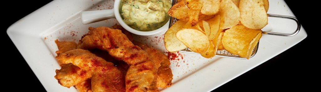 Pirarucu empanado com cerveja preta, pimenta de macaco, molho tártaro e chips de batata